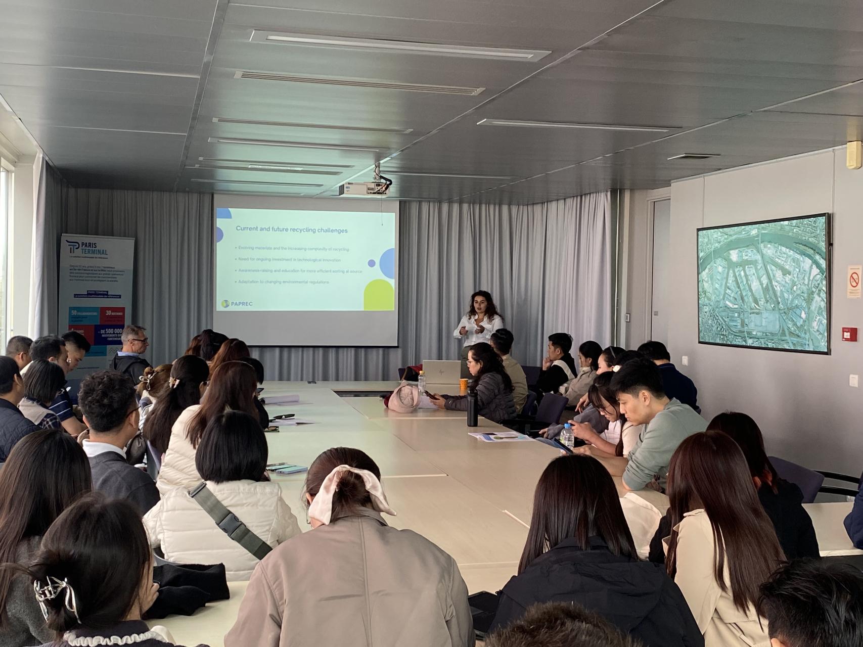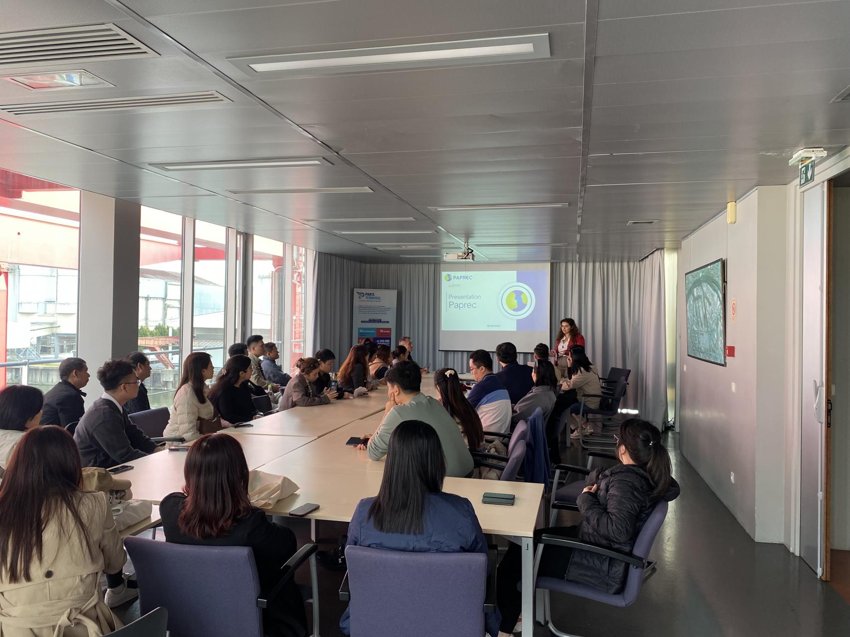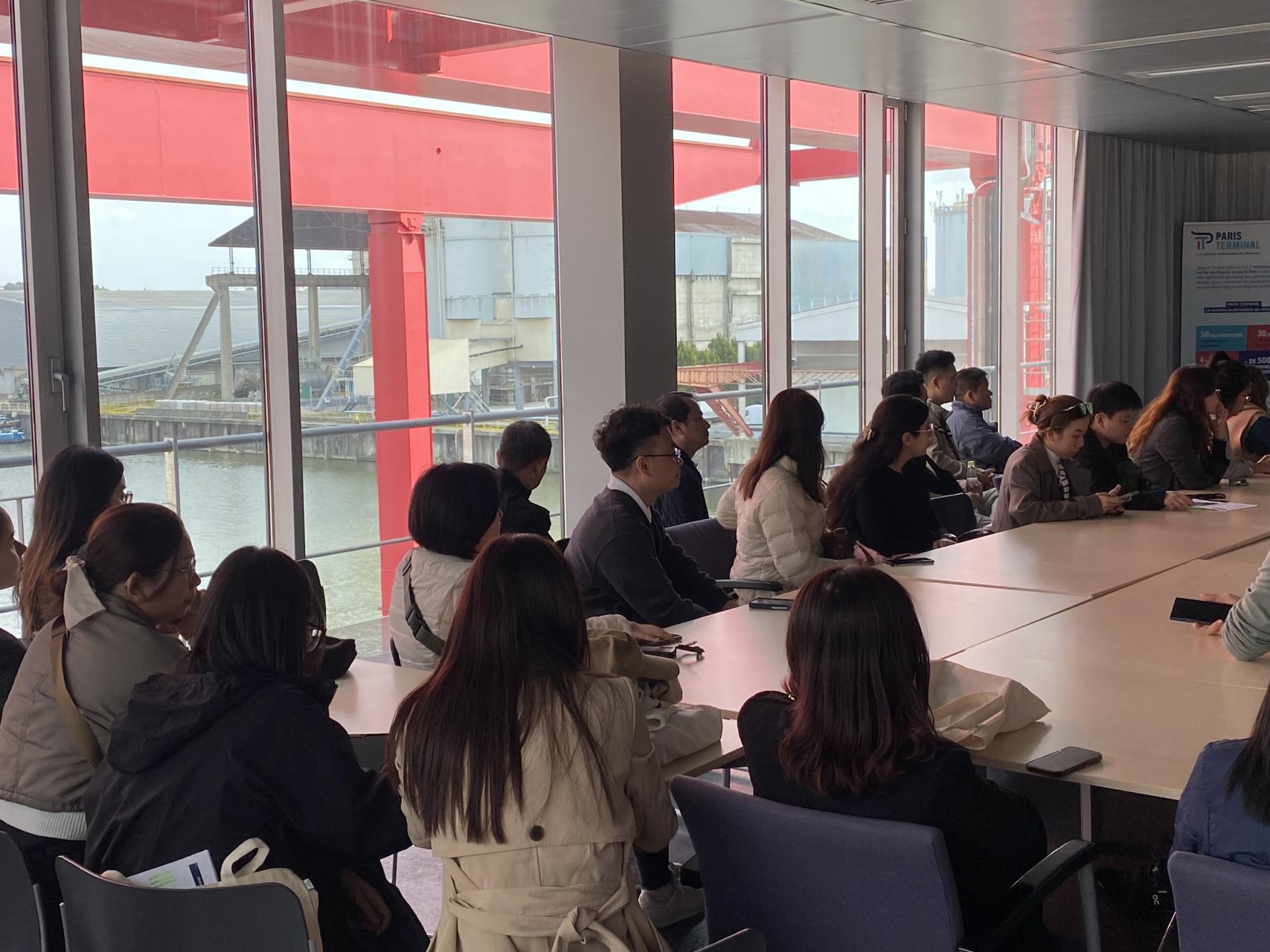 Le deuxième groupe était constitué d'étudiants vietnamiens, qui ont également débuté leur journée dans la salle Paris Terminal. Emma leur a présenté l'entreprise Paprec et son rôle dans le recyclage et la gestion des déchets industriels. Après un déjeuner convivial chez Class'Croute, ils ont à leur tour, bénéficié d'une visite du port avec Gildas, suivie d'une visite approfondie des navires de Marfret, encadrée par Laurence. La journée s'est terminée par une visite chez Cemex, leur offrant un aperçu unique du secteur des matériaux de construction, intimement lié aux échanges commerciaux internationaux.